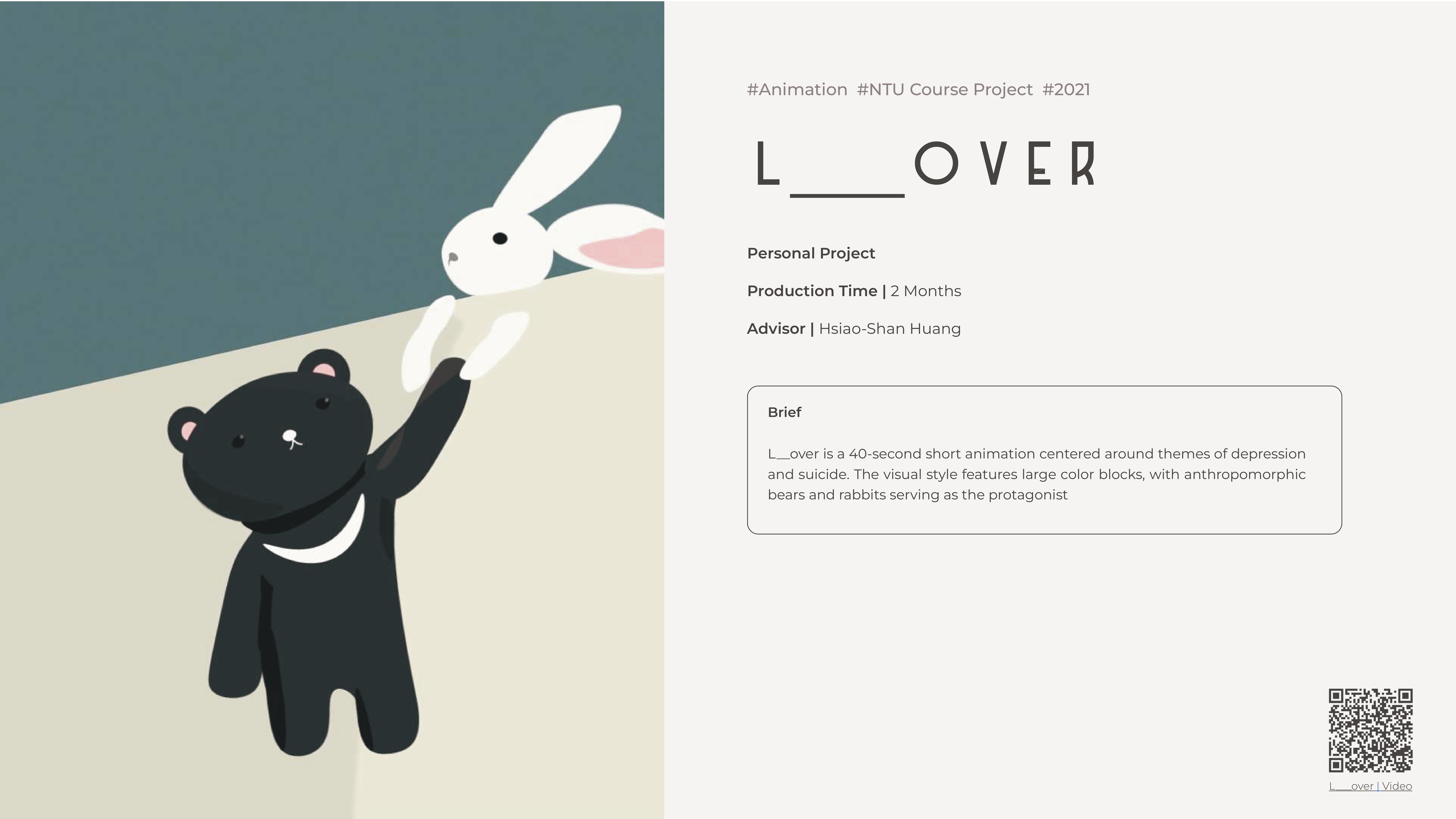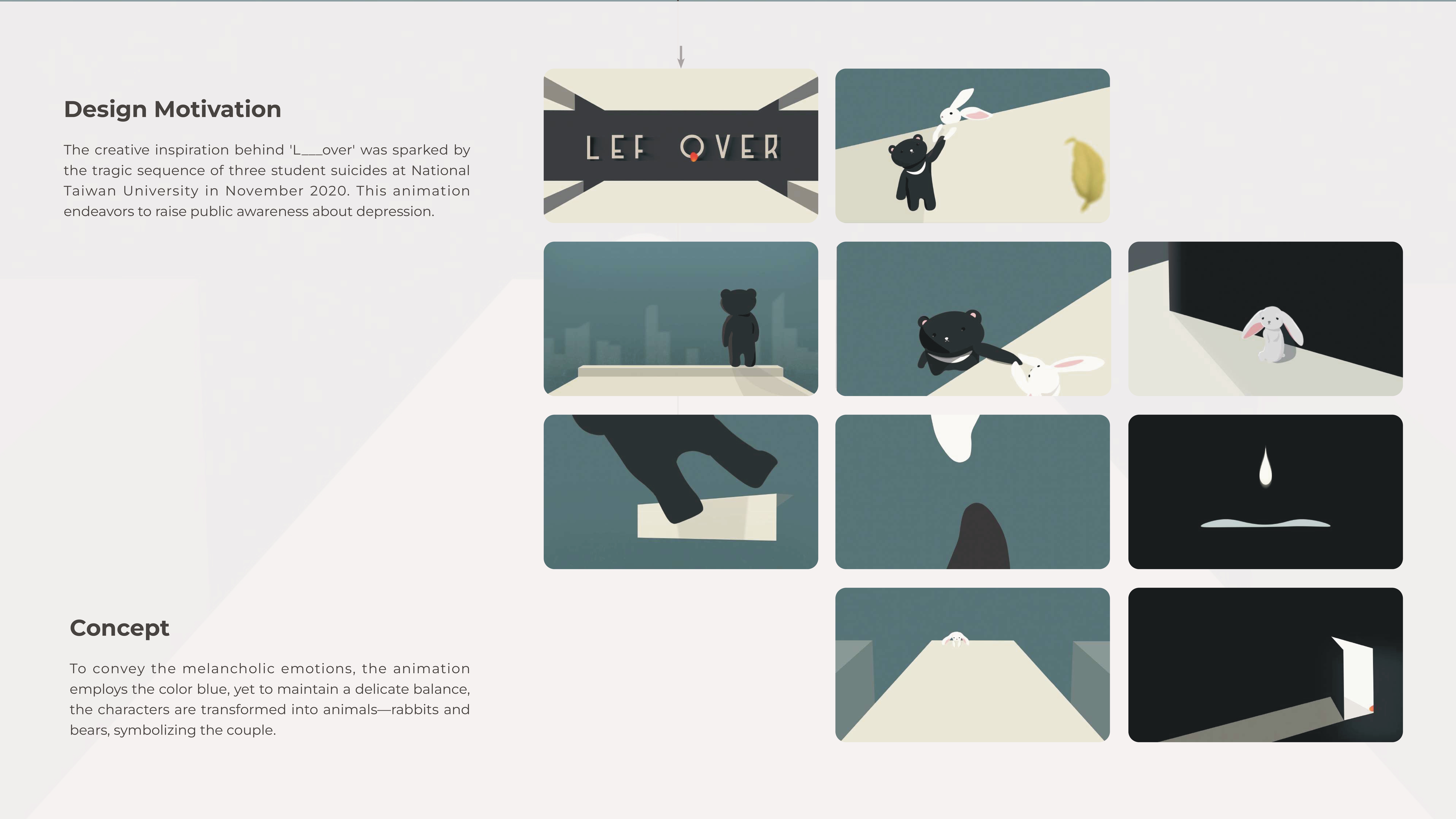 The creative inspiration behind 'L___over' was sparked by the tragic sequence of three student suicides at National Taiwan University in November 2020. This animation endeavors to raise public awareness about depression. The storyline revolves around a couple deeply in love, where the man succumbs to depression and tragically takes his own life, leaving the woman to grapple with profound grief. To convey the melancholic emotions, the animation employs the color blue, yet to maintain a delicate balance, the characters are transformed into animals—rabbits and bears, one white and one black—symbolizing the couple.