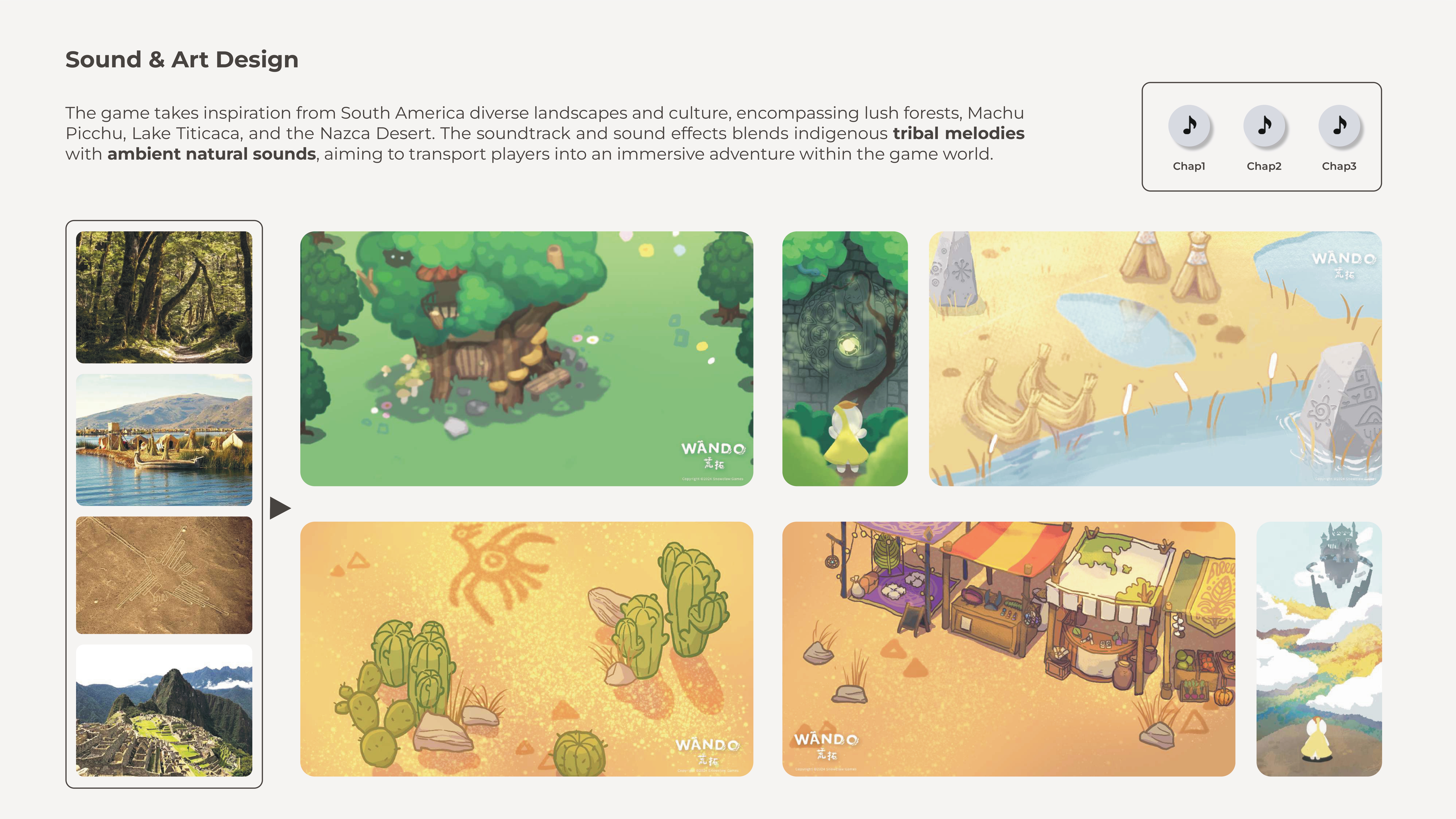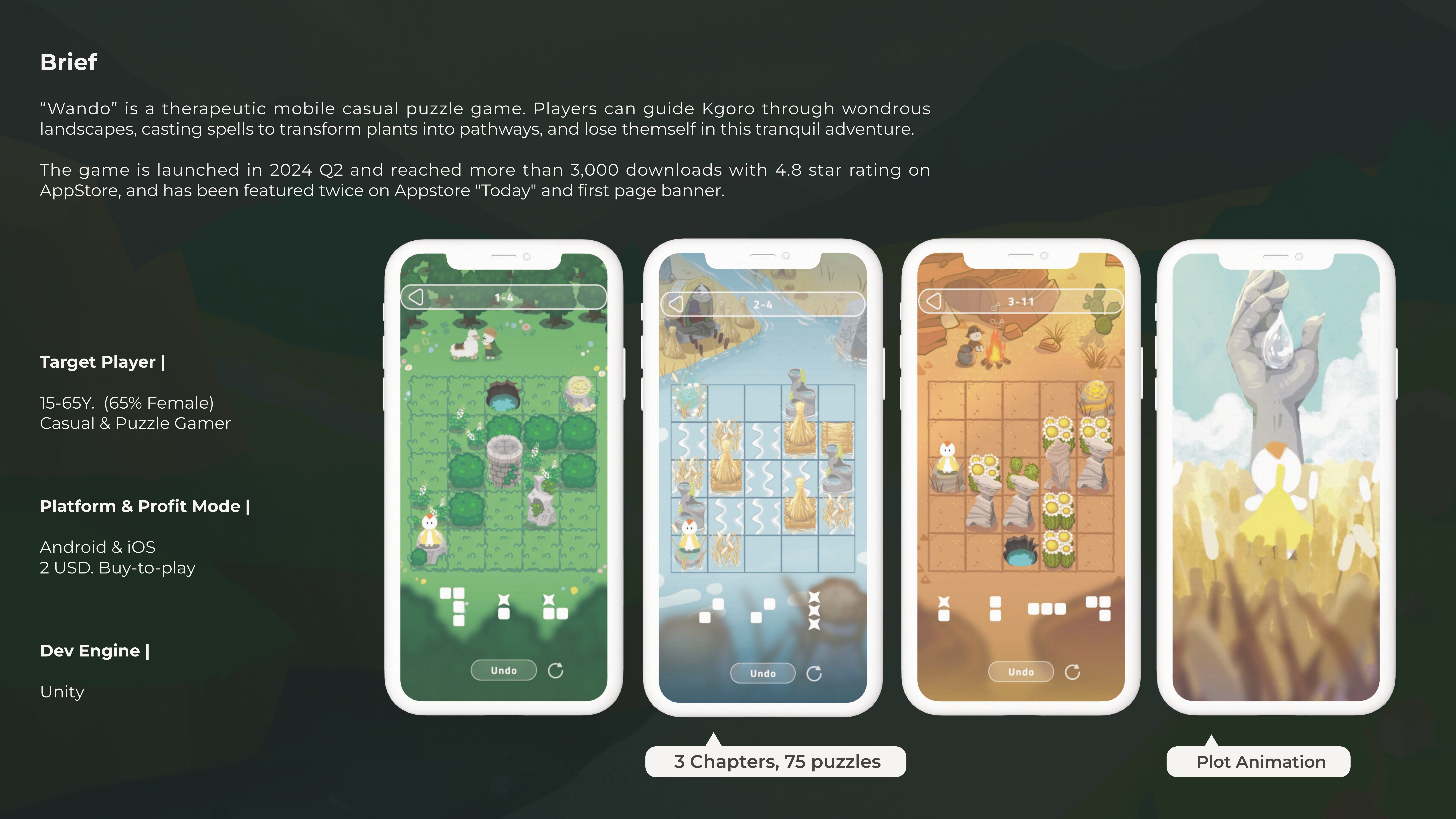 “Wando” is a therapeutic and artistic mobile casual puzzle game. The game is themed around nature and ancient civilizations, and players can embark on an adventure with the protagonist "kgoro" to experience various landscapes and puzzle-solving gameplay.