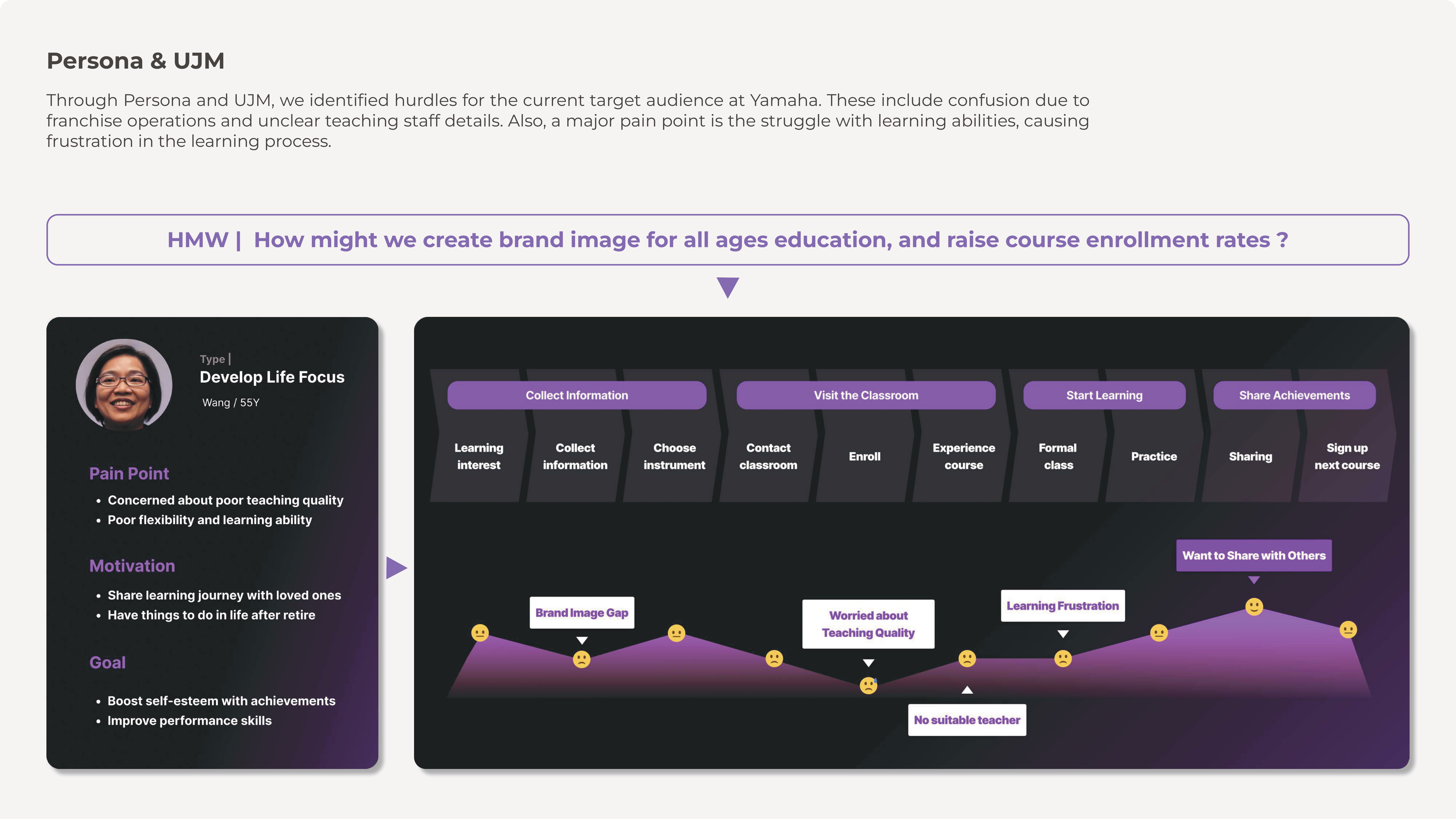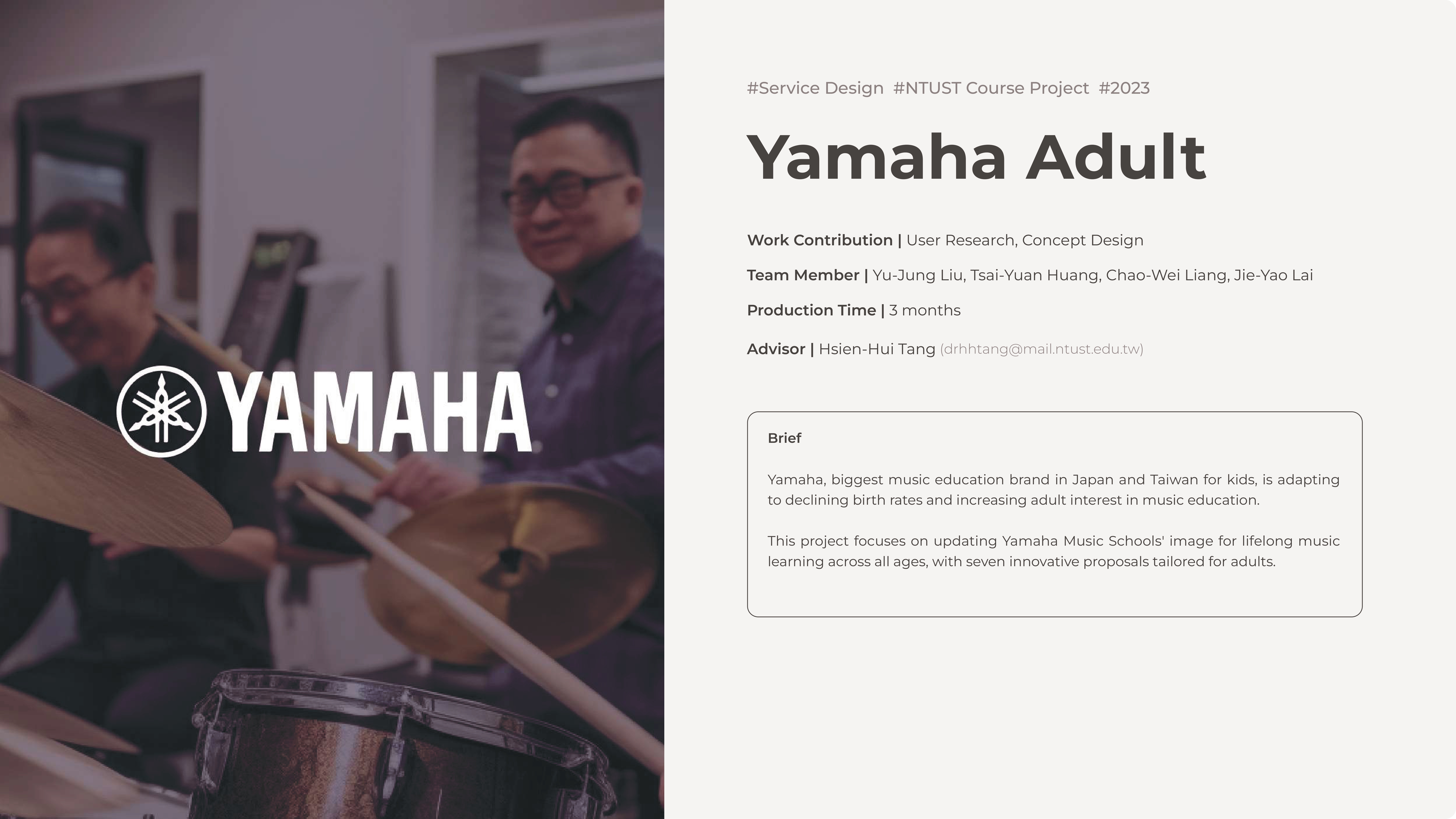 In response to declining birth rates and the rising trend of lifelong learning, we led a comprehensive brand transformation for Yamaha's music education. This project involved a deep analysis of adult learners' needs, resulting in seven innovative service design proposals.